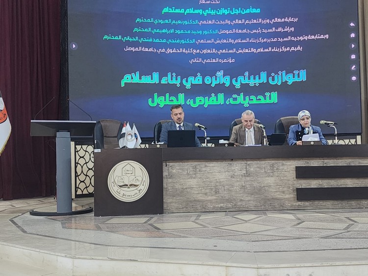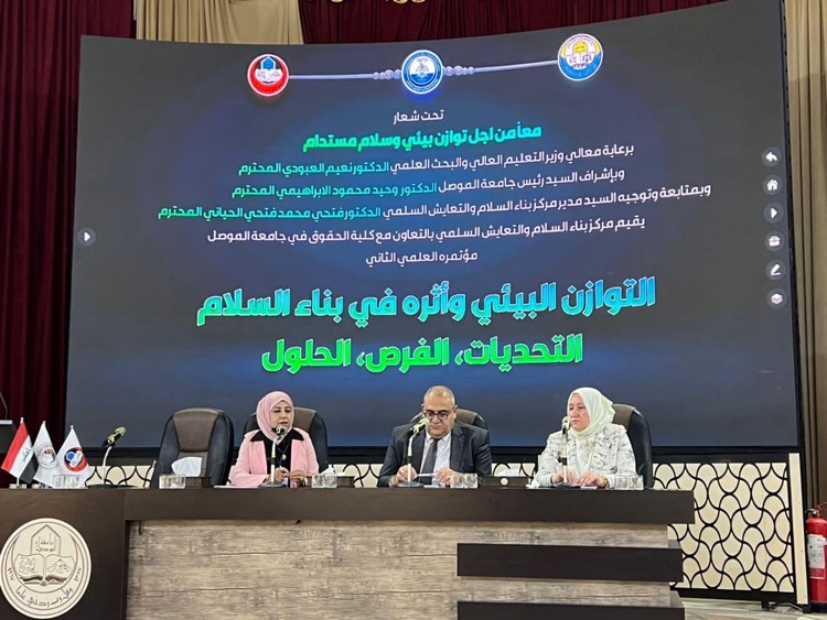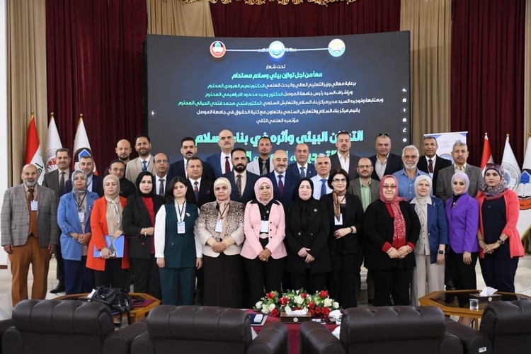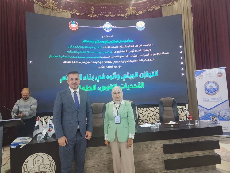 As part of its commitment to advancing its academic presence and enriching the national scholarly dialogue, Prof. Dr. Ibtisam Mohammed Al-Amiri and Assist. Prof. Dr. Ayad Malik Abdul Majeed, from the College of Political Science at the University of Baghdad, participated in the second scientific conference entitled “Environmental Balance and Its Impact on Peacebuilding: Challenges, Opportunities, and Solutions.” Held from October 6-7, 2025, the conference was organized by the Center for Peacebuilding and Peaceful Coexistence at the University of Mosul, in collaboration with the College of Law.
